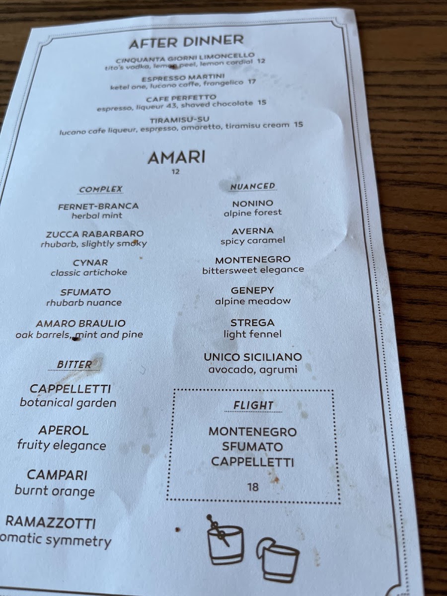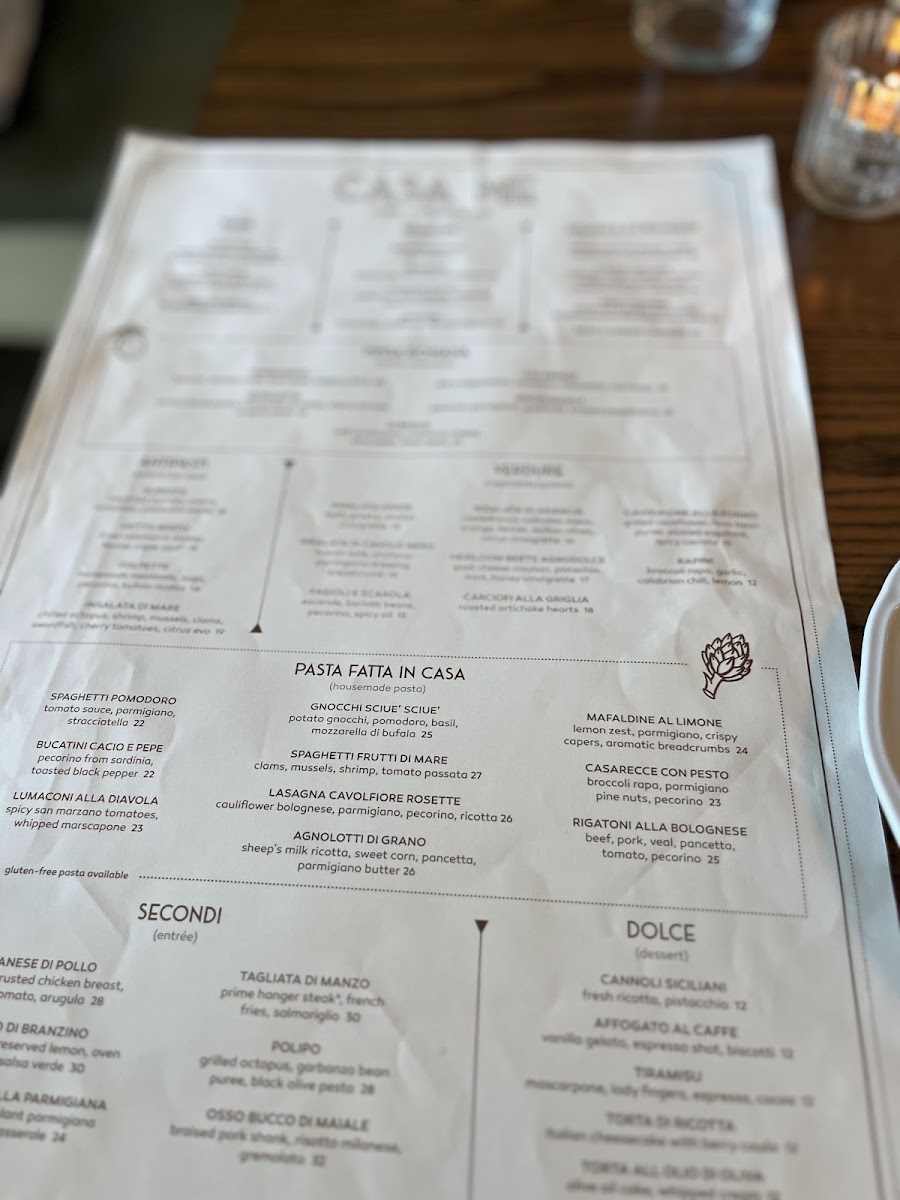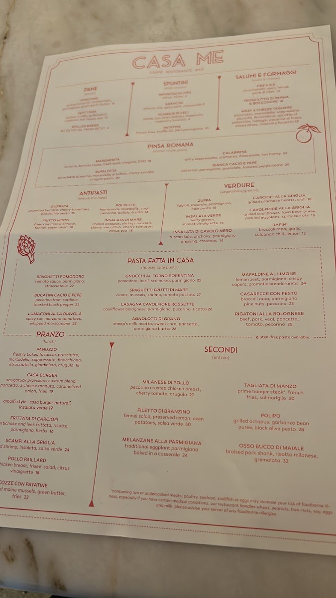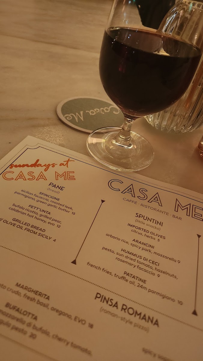 Casa Me offers a delightful selection of dishes that showcase the flavors of Italy. Starting with the Bottle Cocktails, guests can enjoy unique options such as Mezzanotte and Megroni, both priced at 375 ML. The Pane section includes traditional options like Sfincione, Fett'unta, and Grilled Bread with Sicilian Olive Oil. For appetizers, the Spuntini features items such as Imported Olives, Arancini, and Hummus di Ceci. The Salumi e Formaggi section offers premium choices like Prosciutto di Parma 24Mo and a Cheese Tagliere. Moving to the heart of the menu, the Pinsa Romana lineup includes classics like Pinsa Margherita, Gricia Bianca, and Pinsa Bufalotta. The Antipasti list presents dishes such as Burrata, Fritto Misto, and Polpette, perfect for sharing. For a refreshing touch, the Verdure section features vibrant salads like Insalata di Arancia and Insalata Verde. Pasta lovers can indulge in options like Spaghetti Pomodoro, Bucatini Cacio e Pepe, and Spaghetti Frutti di Mare. The Secondi section offers hearty main courses, including Milanese di Pollo, Filetto di Branzino, and Tagliata di Manzo. To finish, the dessert menu includes indulgent treats like Cannoli Siciliani, Torta di Ricotta, and the refreshing Italian Sundae. The diverse menu, along with its carefully curated cocktails, provides a taste of Italy in every bite.
